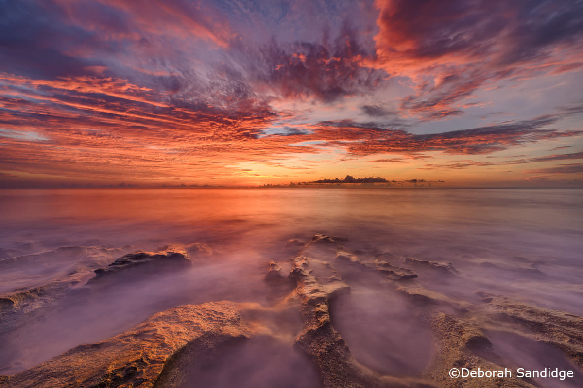 Deborah: Well, those are fun. That is down in Miami beach. I've shot there many, many times. That's a fun target, rich place to shoot because there's so many different things. Like when I go to the beach and I'm shooting sunrise, I'm not shooting at sunrise. I always start an hour before. So that's where to me the beautiful light is. So I had framed up one of the lifeguard stands and it was pitch dark, but I have my tripod. I had a cable release and I knew from experience with the clouds and being that dark, it was going to probably be about a 4 minute, 5 minute exposure time, it's just set that up. So I didn't need any filters because it was totally dark. Also noted that the lifeguard tower was illuminated from the city lights behind me. So that light was falling. So over time there will be enough light gathered on the lifeguard tower plus the illumination of the impending sunrise. So we've got sort of the blue hour. If you saw that photo, there's the blue with this at the horizon line. But yet we have these amazing pink clouds that were in the sky.